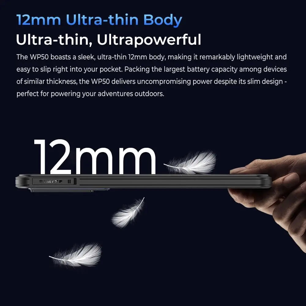 The WP50 boasts a sleek, ultra-thin 12mm body, making it remarkably lightweight and easy to slip right into your pocket. Packing the largest battery capacity among devices of similar thickness, the WP50 delivers uncompromising power despite its slim design - perfect for powering your adventures outdoors.
