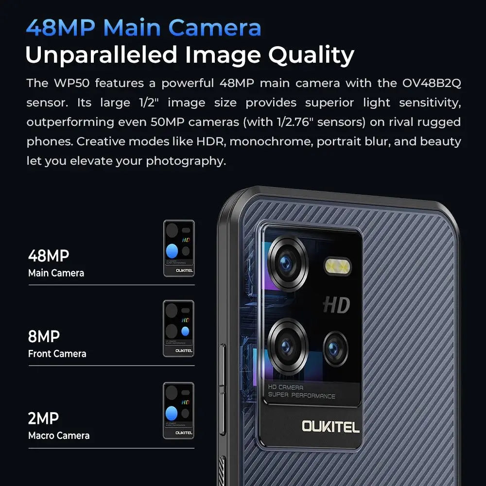 The WP50 features a powerful 48MP main camera with the OV48B2Q sensor. Its large 1/2" image size provides superior light sensitivity, outperforming even 50MP cameras (with 1/2.76" sensors) on rival rugged phones. Creative modes like HDR, monochrome, portrait blur, and beauty let you elevate your photography.