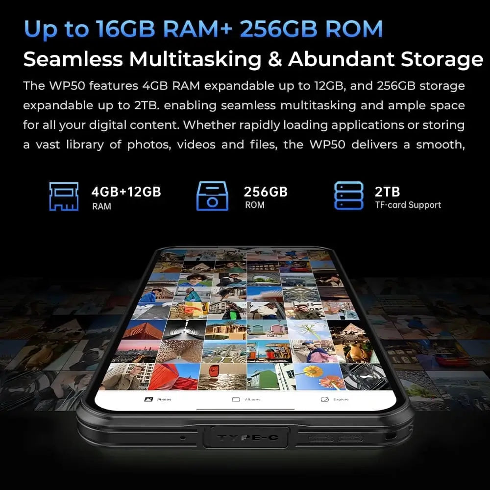 The WP50 features 4GB RAM expandable up to 12GB, and 256GB storage expandable up to 2TB. enabling seamless multitasking and ample space for all your digital content. Whether rapidly loading applications or storing a vast library of photos, videos and files, the WP50 delivers a smooth, uninterrupted experience.